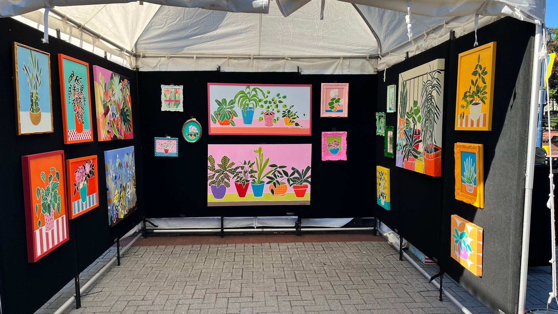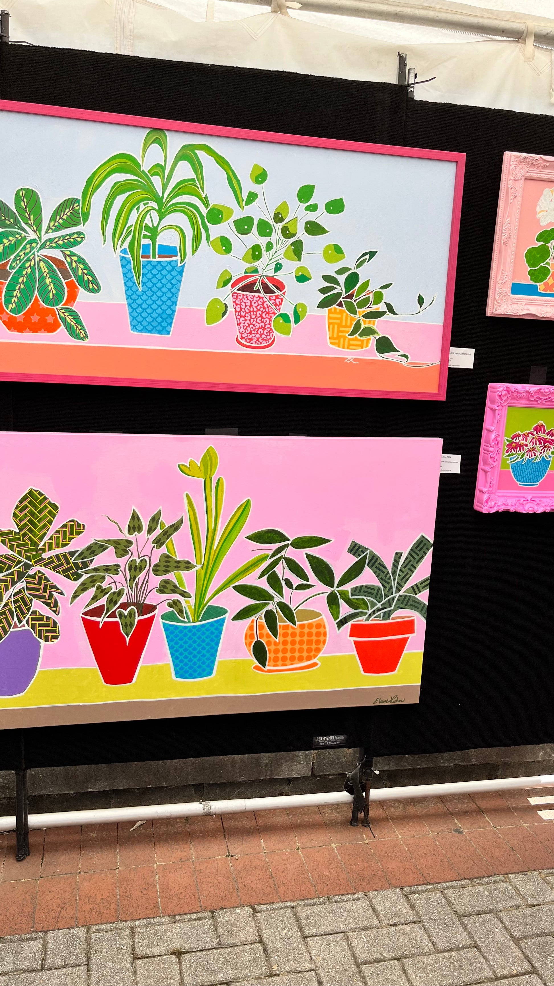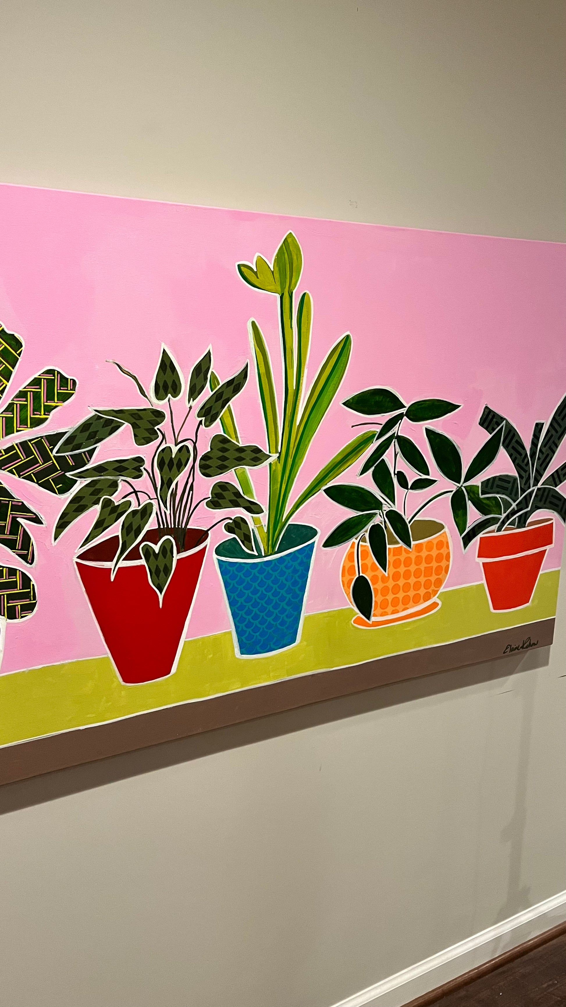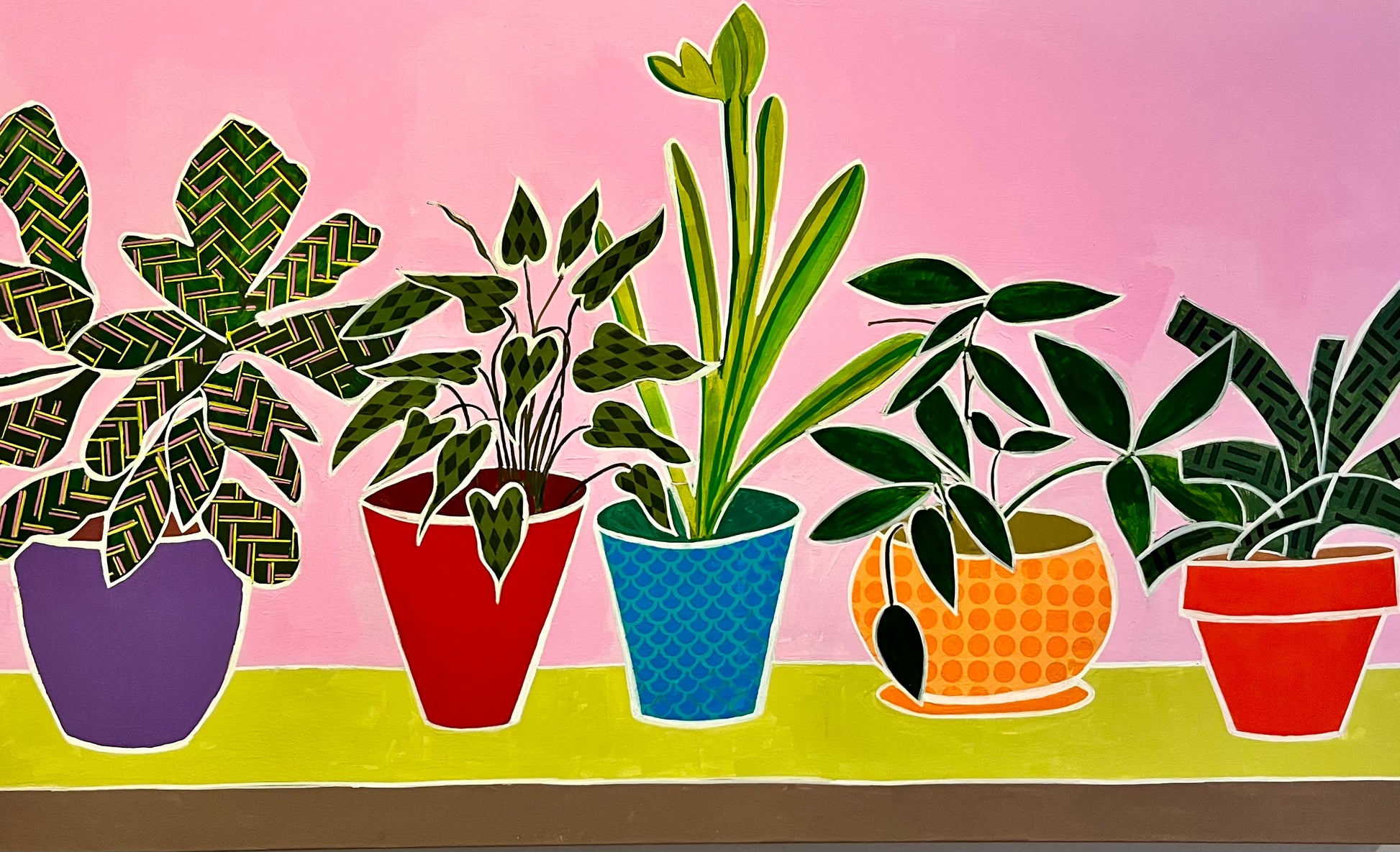Five house plants in decorative pots line a frieze Style canvas. The canvas is 50 inches wide by just 20 inches high and is painted with acrylic paints.
