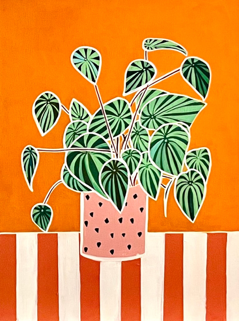 A Watermelon Peperomia housesplant on an orange ground with a red-and-white striped tablecloth.